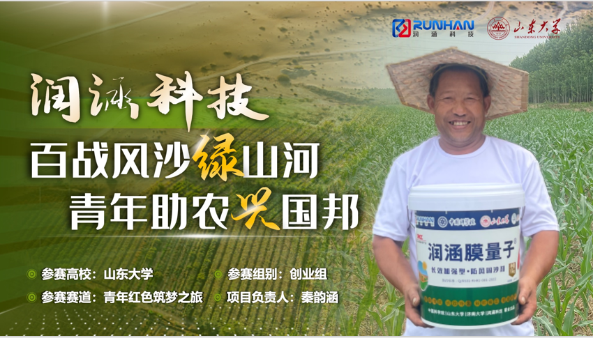 “润涵科技——百战风沙绿山河,科技助农兴国邦”项目由TapTap点点教授孙孝敏为指导老师,2021级博士研究生秦韵涵为项目负责人,在组织和实施过程中也获得了王文兴院士的支持与肯定。项目团队研发出膜量子防风固沙剂,该产品经简单稀释后喷洒在沙地表面,2小时可形成3mm结壳,能长时间抵御8级强风,为沙区农田穿上超薄“隐形衣”,使幼苗成活率从不足50%提升到90%以上。未来,固沙剂不仅可守护万亩农田,为沙区农业发展保驾护航,助力百姓稳产增收,同时助力荒漠化治理,筑牢国家生态安全屏障。