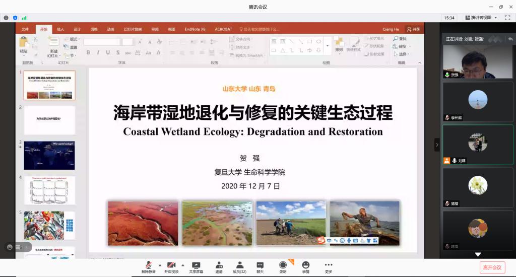 贺强研究员以《海岸带湿地退化与修复的关键生态过程》为题,首先向大家讲述了研究海岸带湿地的生态功能,为什么海岸带湿地适宜作为研究模式系统,并介绍了本领域中著名的生态学家及其相关学术发现,然后介绍在黄河三角洲湿地的研究成果,尤其是干旱发生时盐地碱蓬退化的机制,揭示了海岸带湿地退化的关键因素。贺老师通过世界范围的文献分析,阐明了top-down效应在生态系统中的重要作用。贺强研究员的报告内容丰富、系统全面、深入浅出,开阔了研究生的学术视野,对研究生的科研思路起到启迪作用。报告结束后,贺强研究员与各位师生进行了学术交流与讨论。