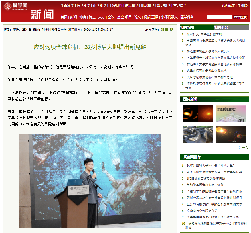 《中国科学报》以“应对这项全球危机,28岁博后大胆提出新见解“为题,科普报道了相关研究成果和研究历程。报道中写到:“一份敢想敢做的尝试、一份得遇良师的幸运、一份拼搏的态度,使现年28岁的 香港理工大学博士后李长超在新领域不断前行”。具体报道见:https://news.sciencenet.cn/htmlnews/2024/11/534664.shtm